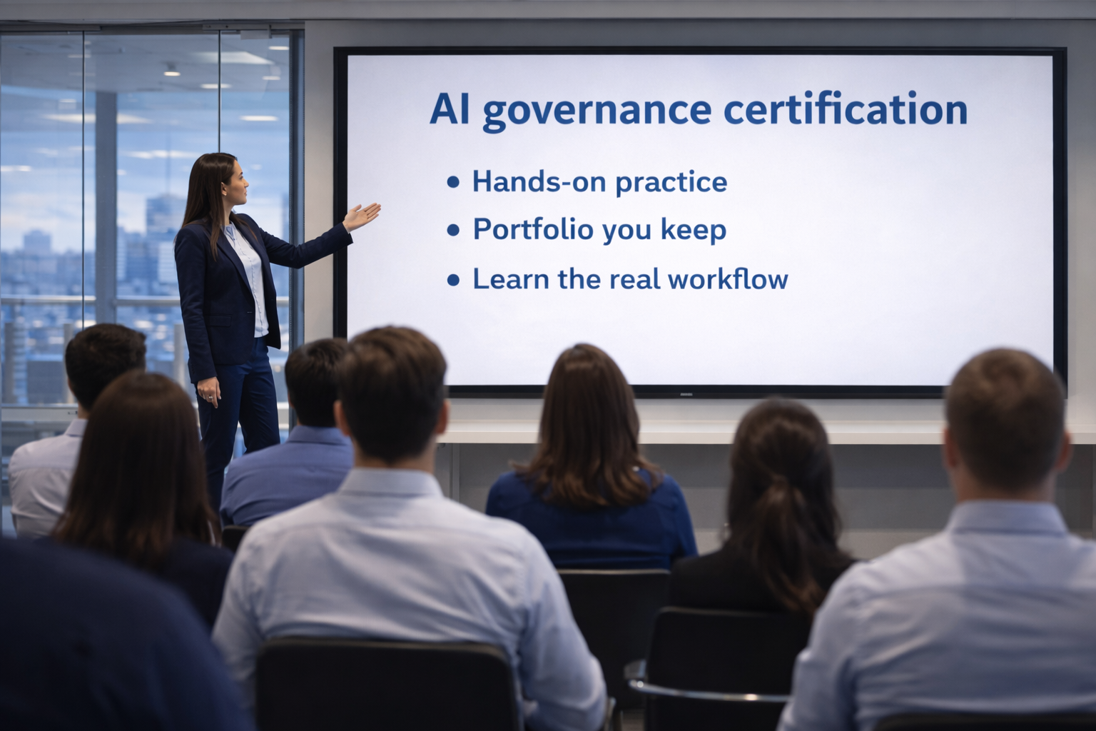 - Hands-on, not test prep. You build real AI governance documents for a real organization: policies, risk assessments, impact assessments, compliance memos, and audit evidence.